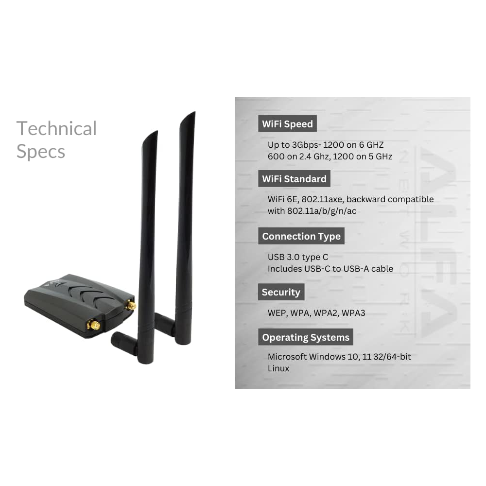 AWUS036AXML is a new WiFi 6e (802.11axe) tri-band 2.4 GHz / 5 GHz / 6 GHz WiFi USB adapter. It supports speeds up to 3000Mbps when used with a compatible WiFi 6E router (there are various stream models of WiFi 6E routers, 800- 1200 mbps will be a more common speed with most routers).