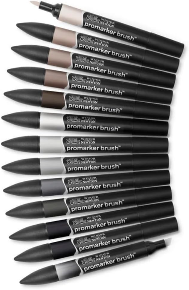 Winsor & Newton Promarker Brush is a versatile twin-tipped illustrator’s marker featuring a broad nib and a highly durable brush nib providing the ultimate precise and flexible line control. Set contains Warm Grey 1, Warm Grey 2, Warm Grey 3, Warm Grey 4, Warm Grey 5, Cool Grey 1, Cool Grey 2, Cool Grey 3, Cool Grey 4, Cool Grey 5, and two Black markers.